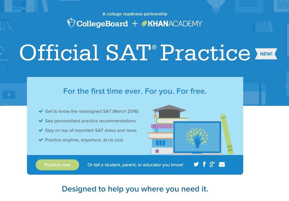 2015年6月2日,可汗学院在其网站上公布了4套完整的新SAT题目。College Board (美国大学理事会) 与可汗学院深度合作,为考生提供免费的新SAT在线学习平台,其中包含官方考题资料、视频课程等。