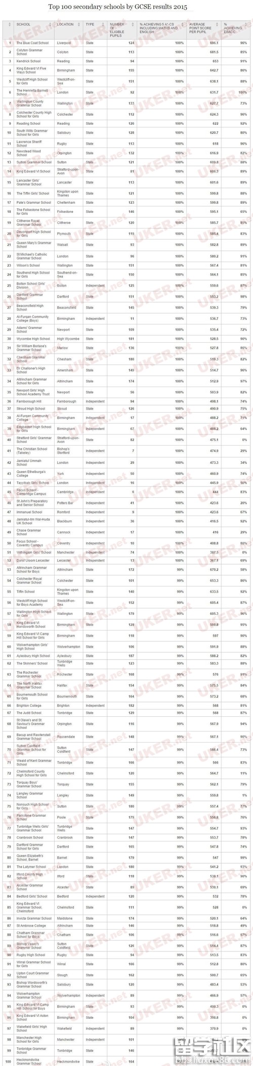 最后,附上2015年根据A-Level、GCSE成绩排名的英国中学TOP100榜单: