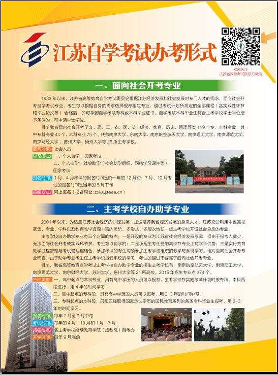 1983年以来,江苏省高等教育自学考试委员会根据江苏经济发展和社会发展对专门人才的需求,面向社会开考自学考试专业,考生可以根据自身的需求选择报考相应专业,通过考试计划所规定的全部课程(含实践性环节和毕业论文等)合格后,即可拿到自学考试专科或本科毕业证书。自学考试本科毕业生符合主考学校学士学位授予条件的,可申请学士学位。