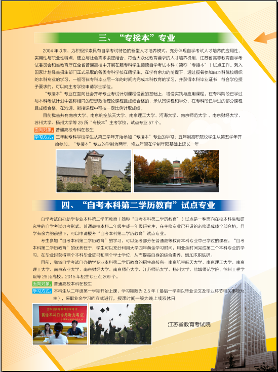 目前,我省自学考试自办助学专业本科第二学历教育的招生高校有:南京航空航天大学、南京理工大学、南京理工大学、南京农业大学、南京财经大学、南京师范大学、江苏师范大学、扬州大学、盐城师范学院、徐州工程学院等26所高校。2015年招生专业点209个。